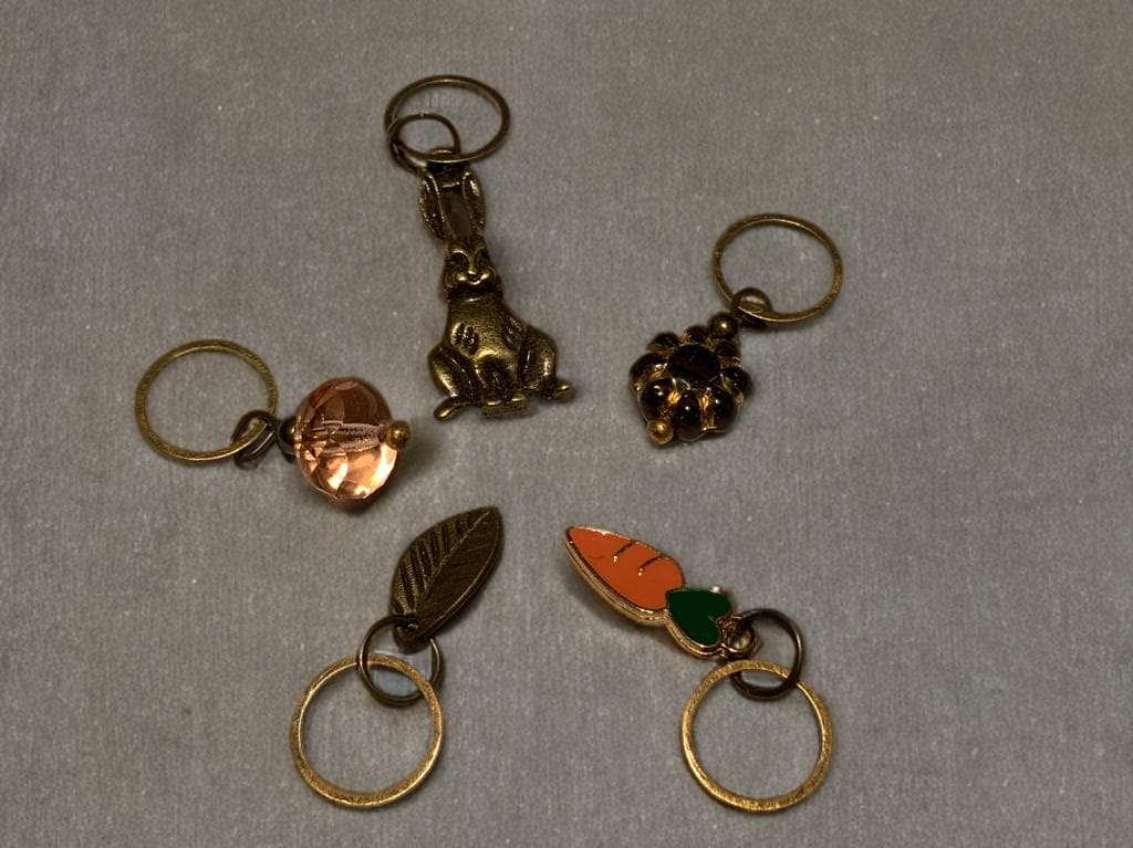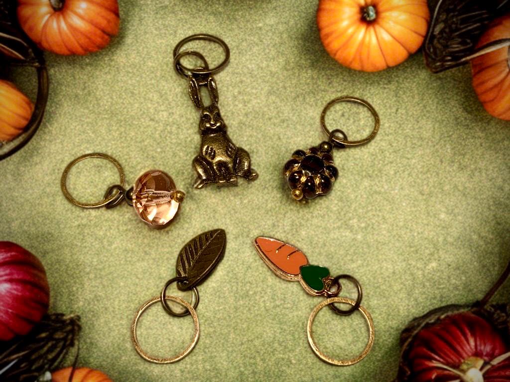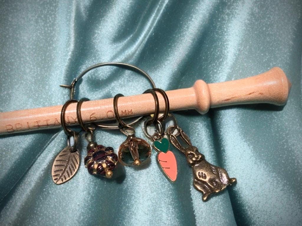 The set consists of 5 handmade stitch markers, presented in a handy ring.