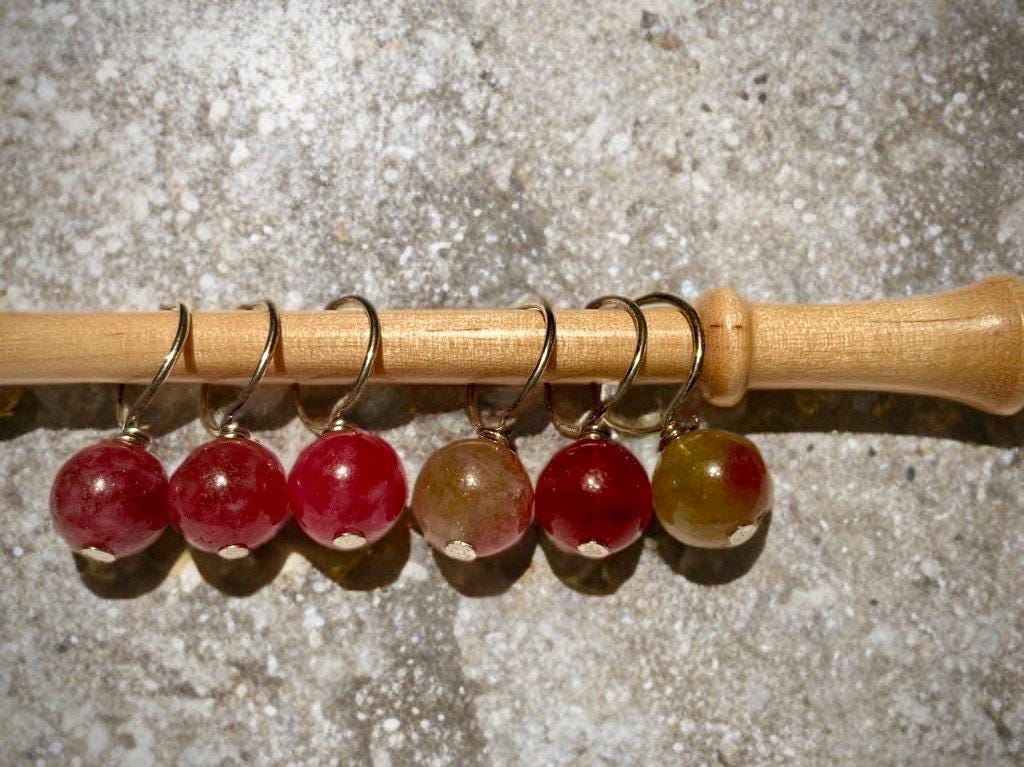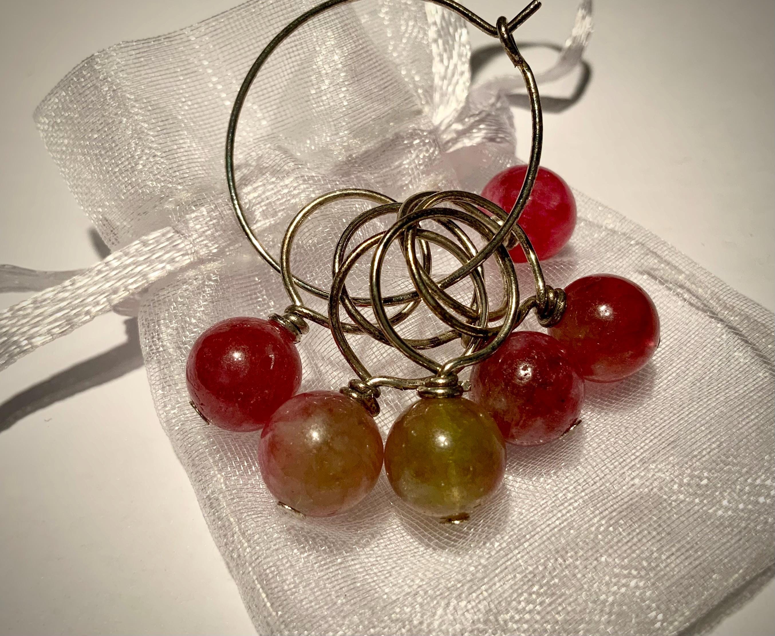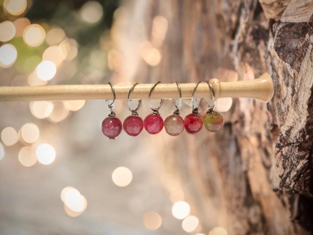 The set consists of 6 handmade stitch markers made from quartz beads, presented in a handy ring.