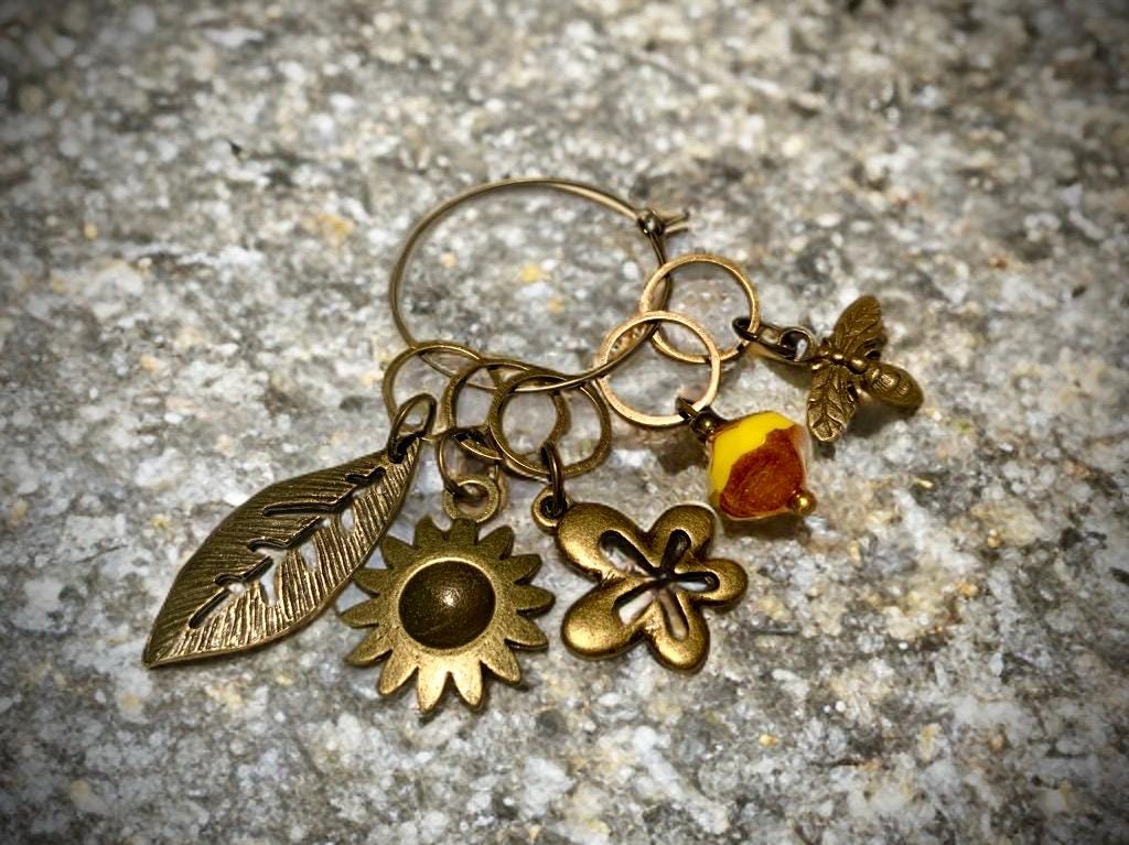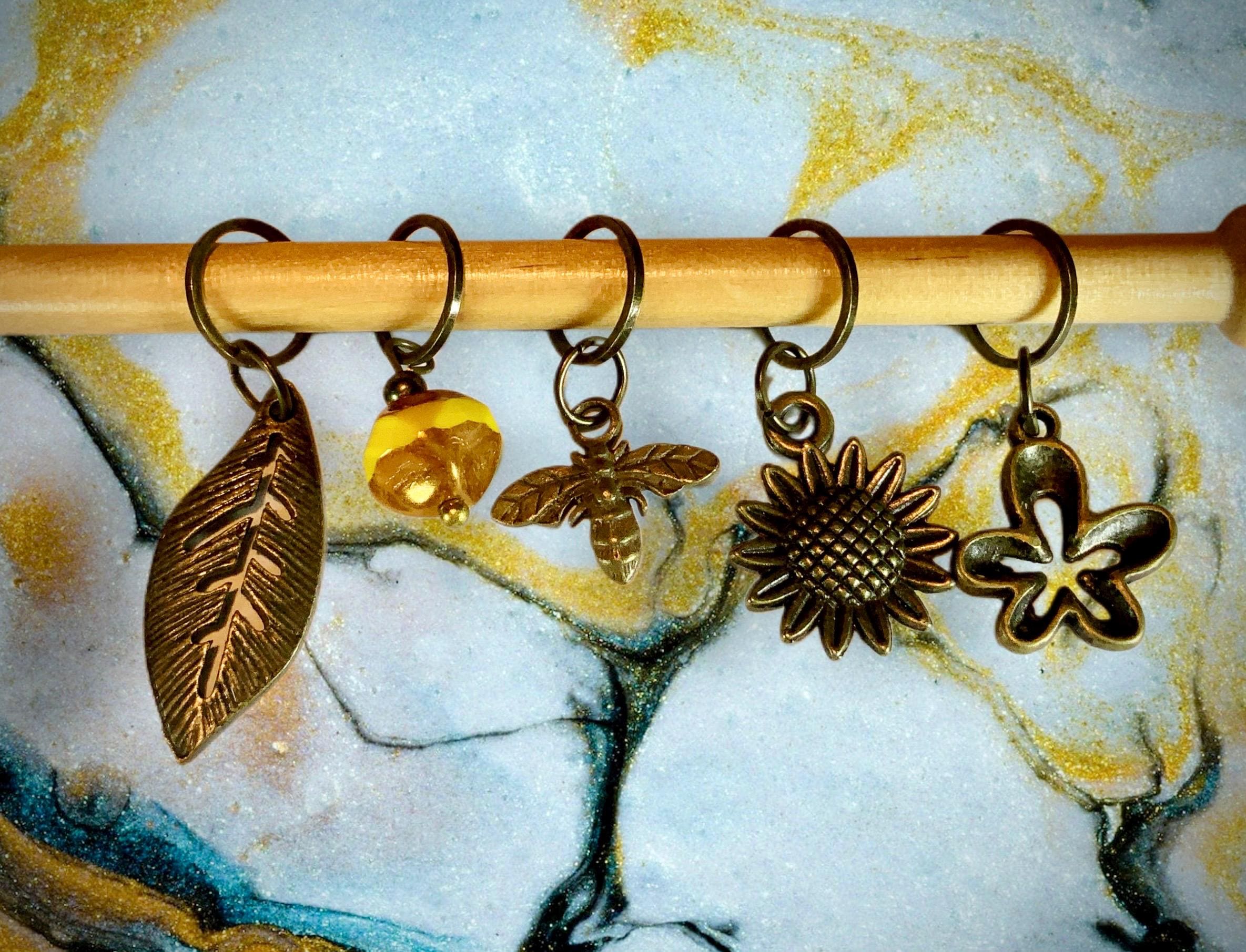 The set consists of 5 handmade stitch markers (one of which is a Bohemian glass bead), presented in a handy ring.