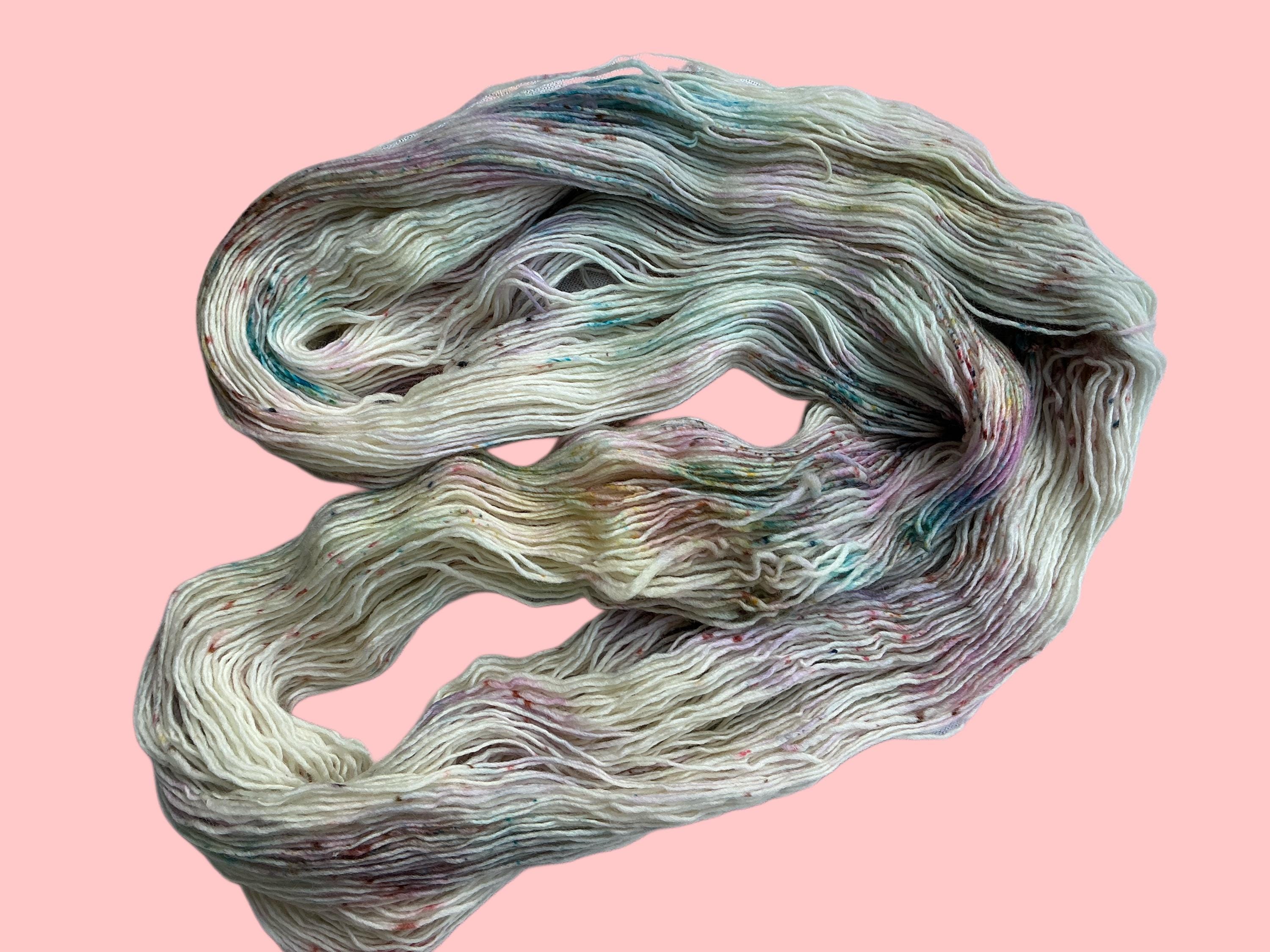 Since the skeins are hand-dyed by the artist LIFE IN THE LONG GRAS (LITLG), no two skeins are alike. There may be significant differences in color depth and the distribution of light and dark areas compared to the delivered yarn.