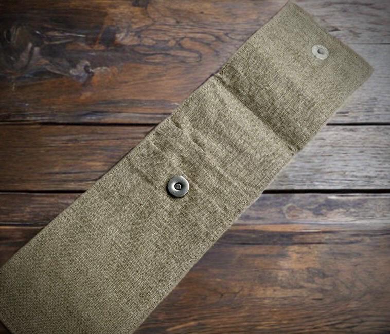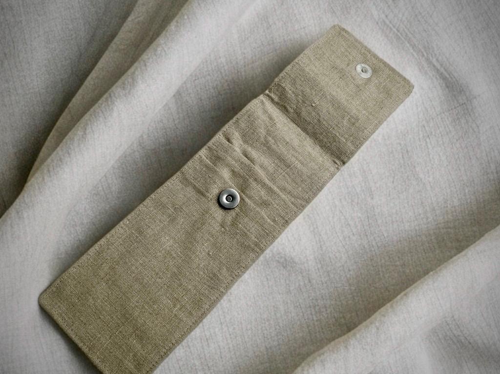 Small linen pouch for craft supplies or double-pointed needles. It has a magnetic closure. Two pockets hold items such as crochet hooks, double-pointed needles, knitting tips, cables, a tape measure, scissors, stitch markers, etc. It's also ideal for travel due to its thinness.
