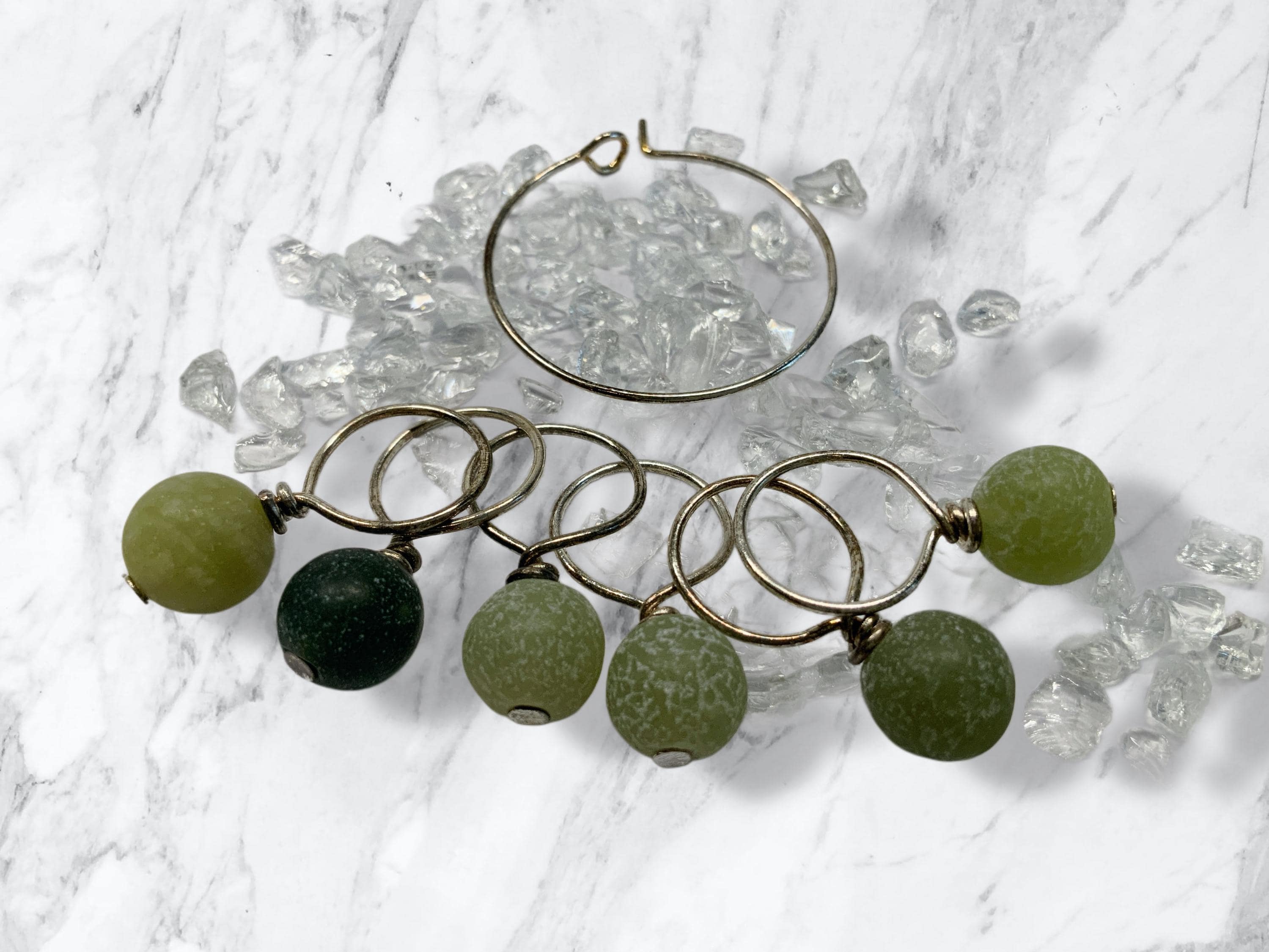 The set consists of 6 handcrafted gemstone stitch markers, presented in a handy ring.