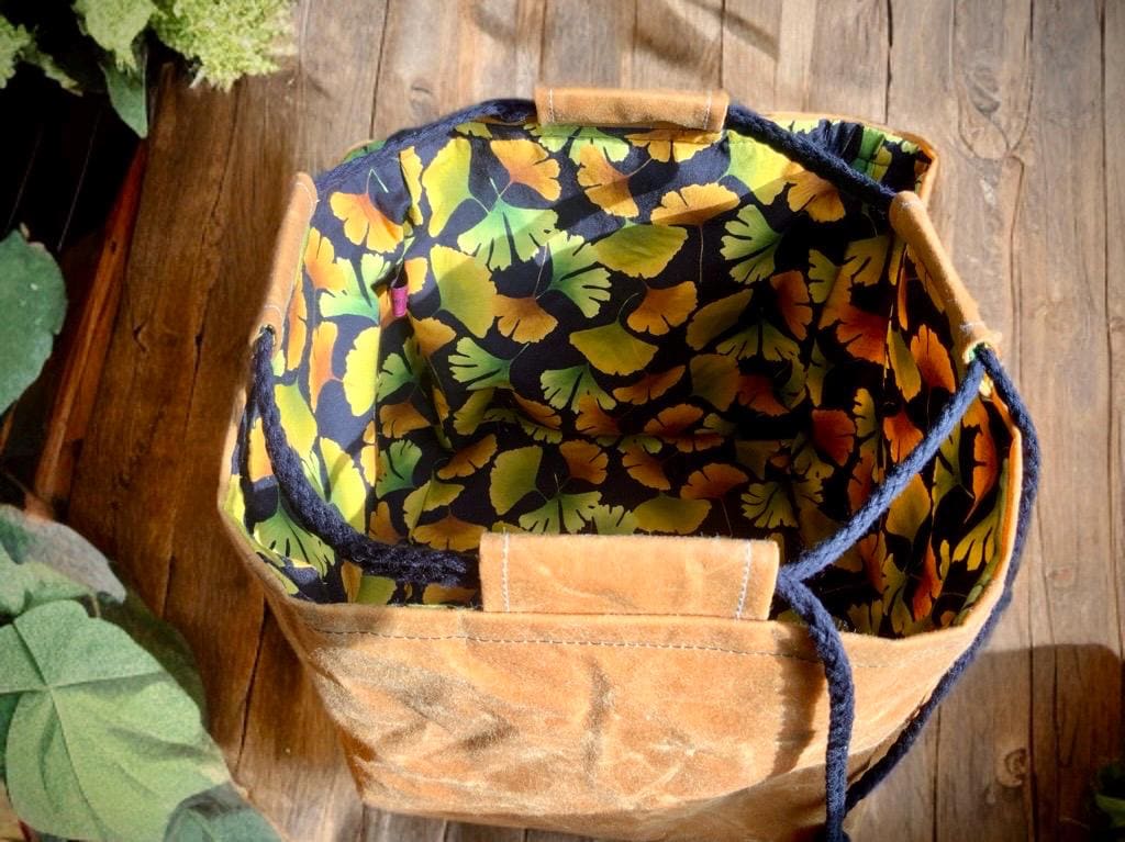 The special finish of this fabric gives the project bag the characteristic used look that is so typical of oilskin.