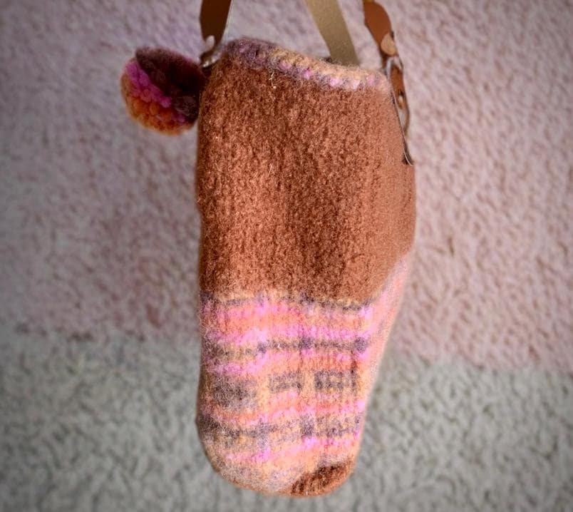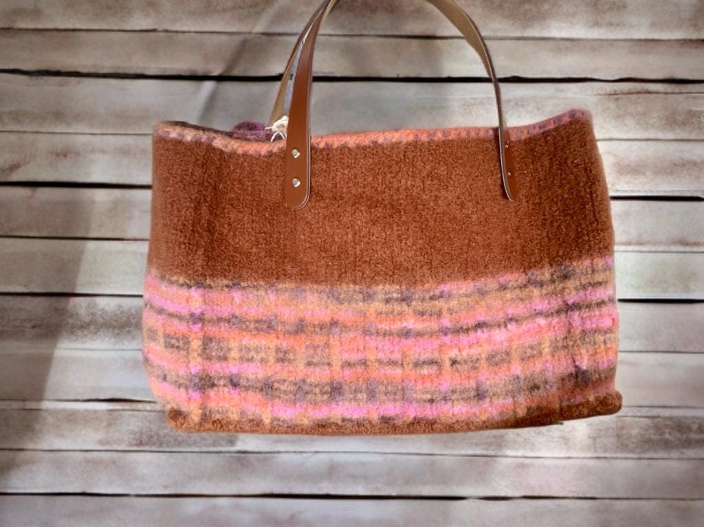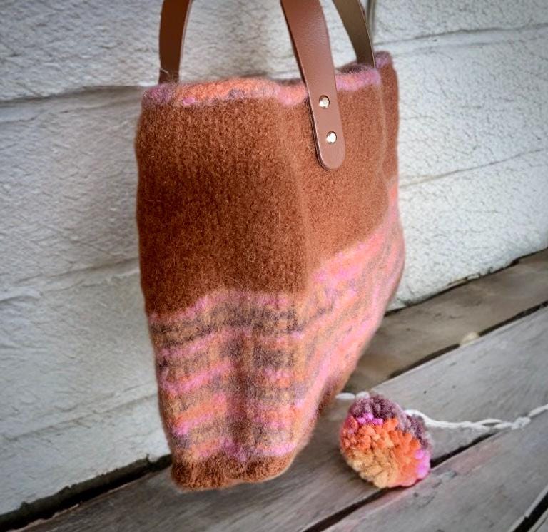 Hand-knitted and felted wool bag with leather handles – 100% virgin wool | Handmade unique piece